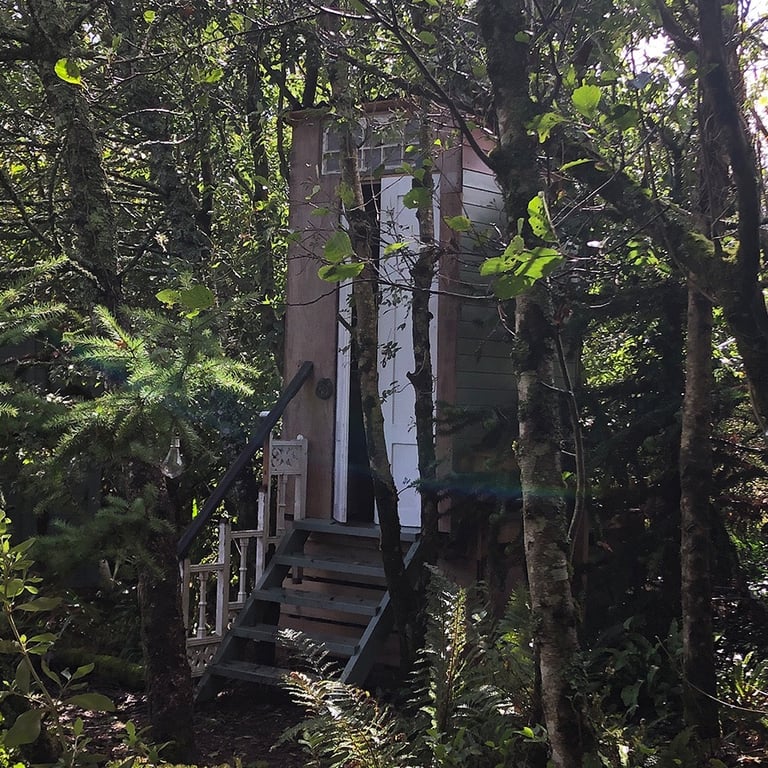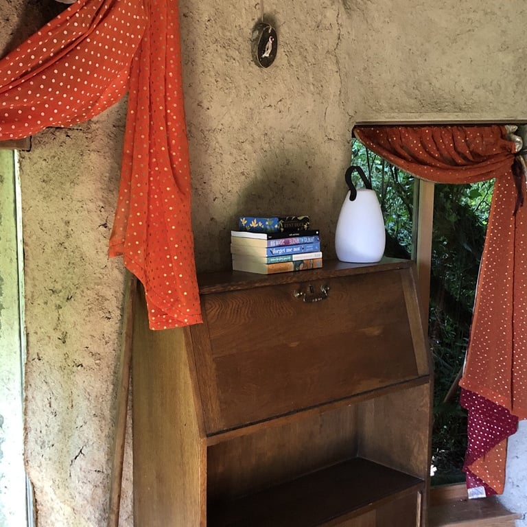 There is a small writing bureau inside - a space for you to gather your thoughts and explore your ideas. We also provide a small selection of reading material. The space has solar powered fairy lights, chargeable lanterns, a reading lamp and battery candles. We do allow candles but please do not leave them unattended.